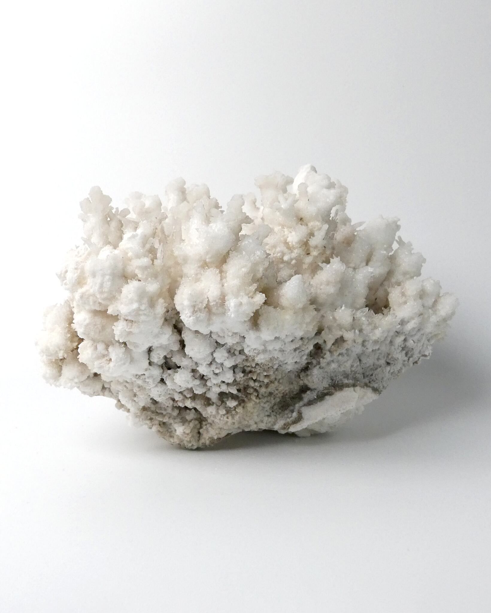 雲貴高原の静かな洞窟で、雫が千年の時を編んで生まれた白い花の塔は、ふわりと綿雲のように広がり、凛とした気配を纏う。 表面は絹のようにやわらかな白を湛え、近づくほど繊細な結晶の房が重なり、秋の霜が岩肌に咲いたような端正さがある。