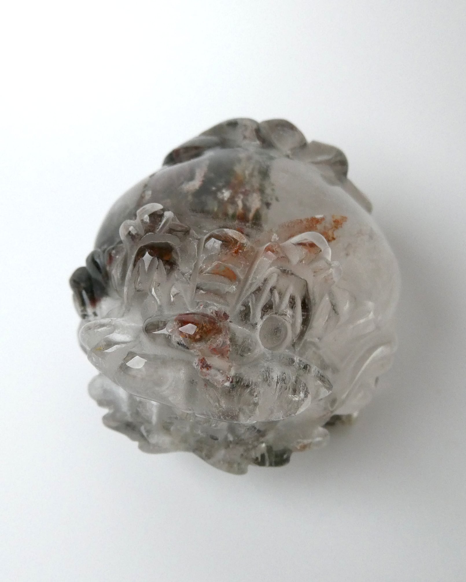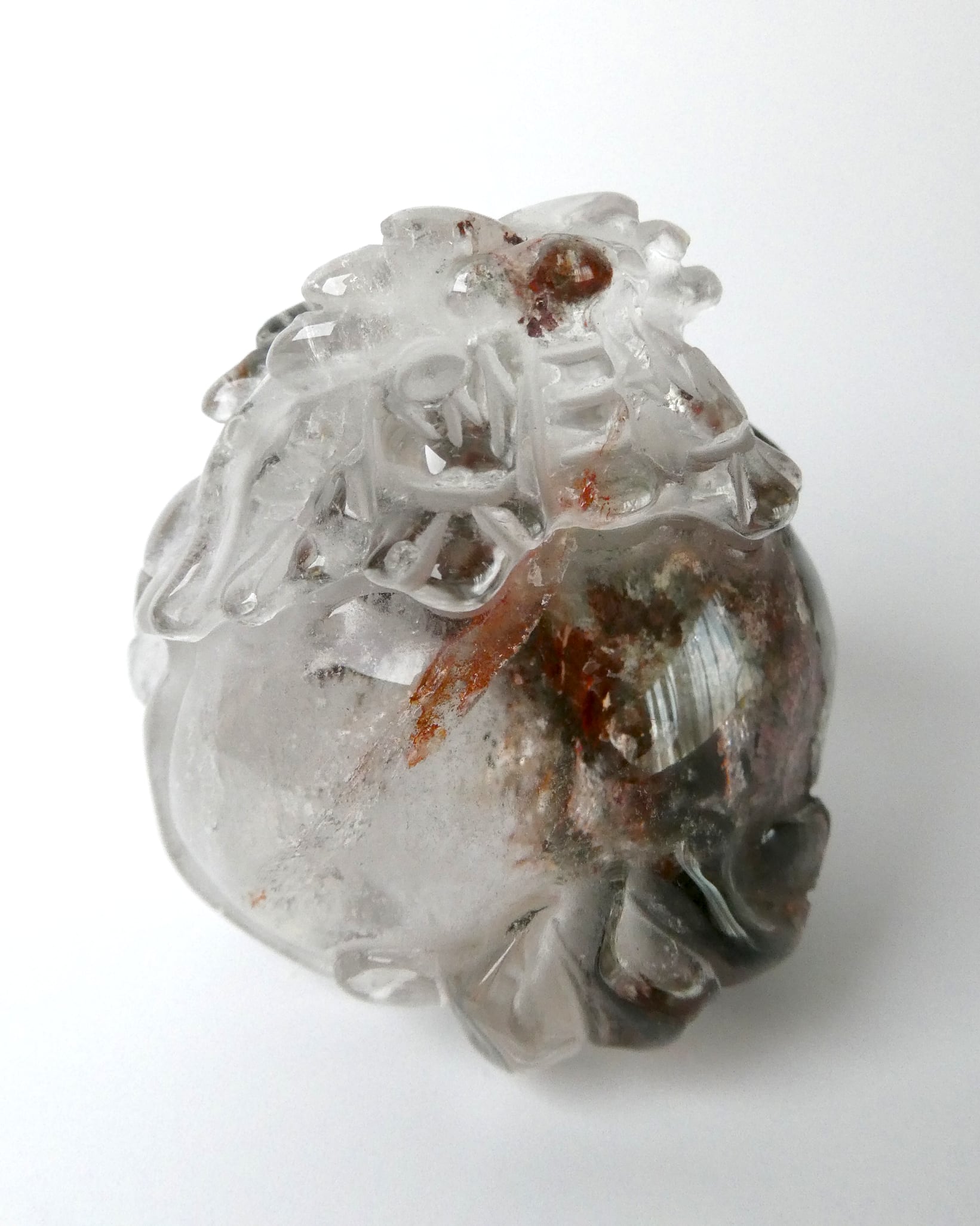 この子は、ブラジル産の「四季ガーデンクォーツ」を使用し、彫刻職人によって丁寧に手彫りされた作品です特徴として、高い透明度を保ちながらも、龍亀の顔がはっきりと見える美しい仕上がりまんまるとした体に愛らしい笑顔がとてもキュートです。