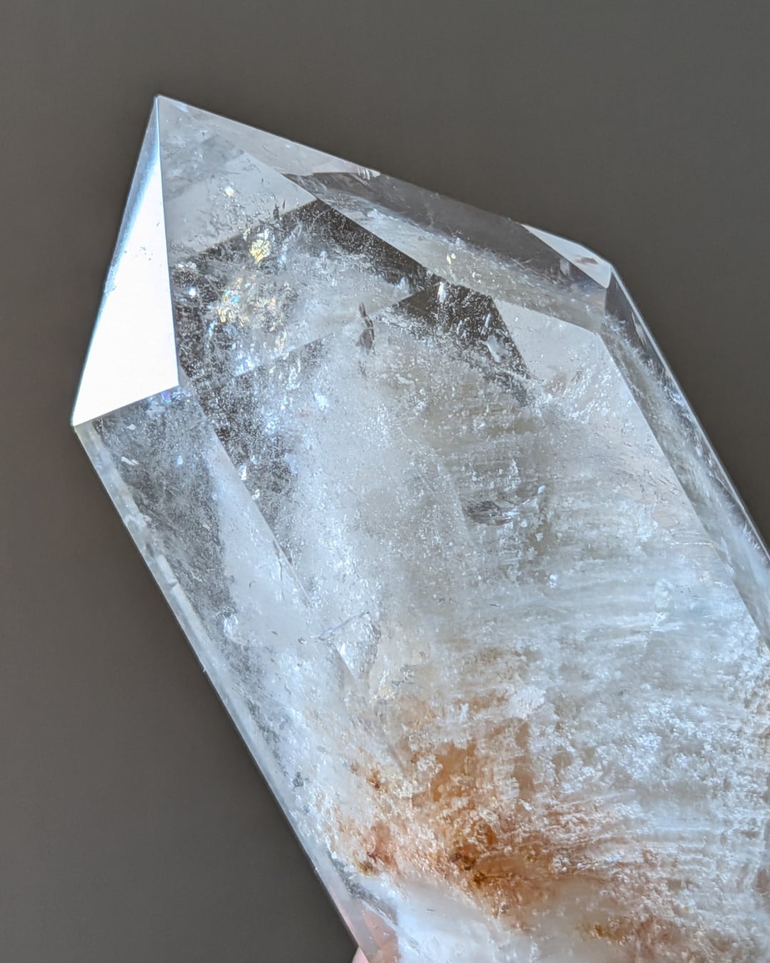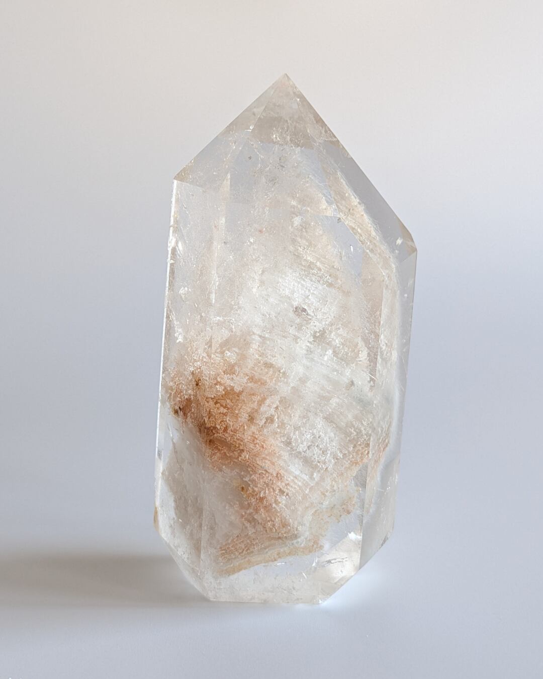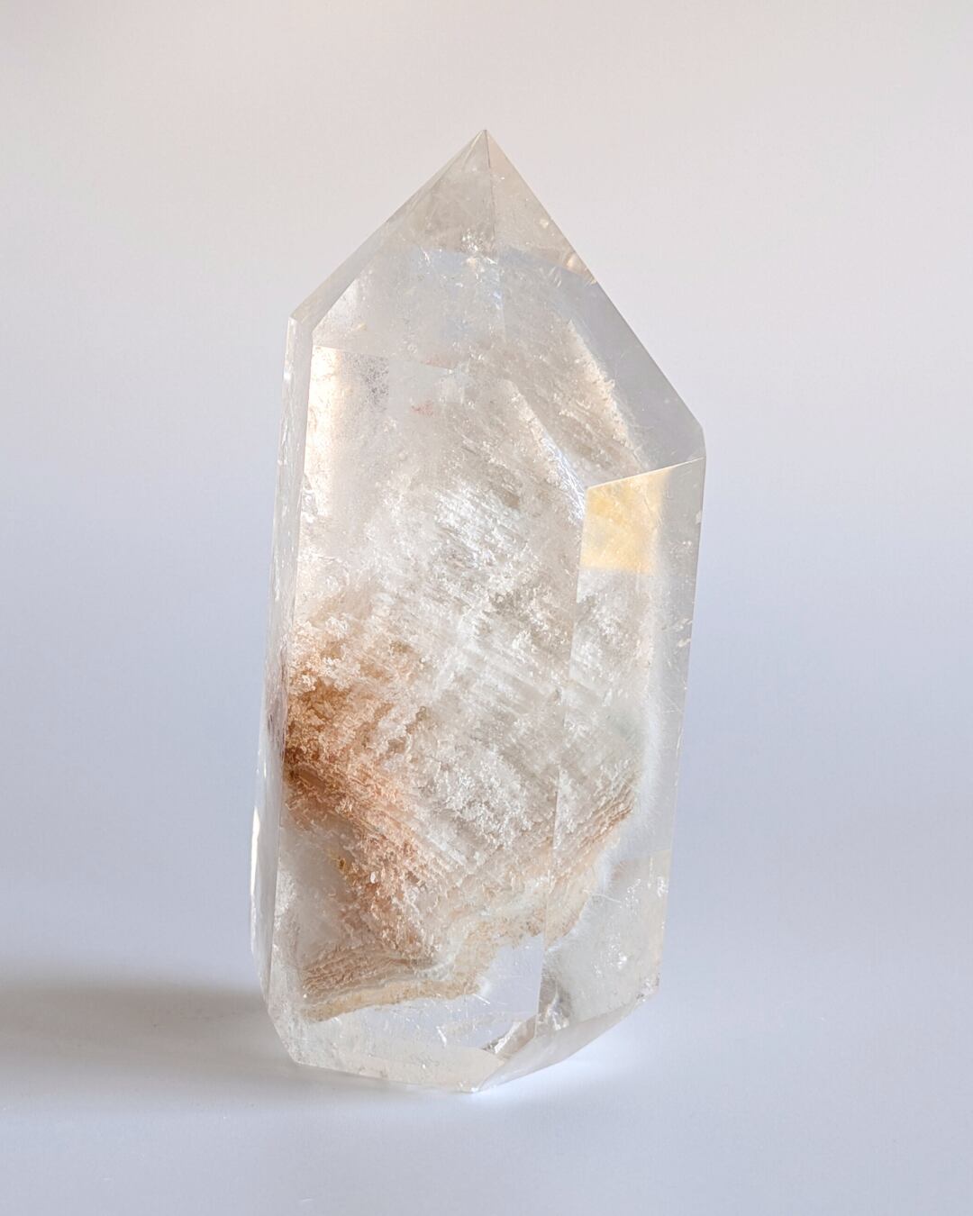 「千層」と呼ばれる緻密なレイヤーは、長い年月が織りなす年輪のように美しく積み重なり、その間を縫うように繊細な「ラビットヘア(針状結晶)」がふわりと漂います。
