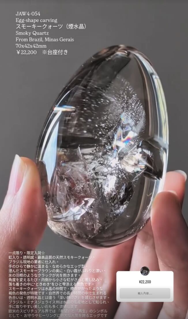 手のひらで静かに温まる、なめらかなエッグ型。澄んだスモーキーブラウンの奥に、白い霞がふわりと漂い、氷の羽根のようなクラックが光を抱きます。角度を変えるたび、内側から小さな虹がさっと差し込み、落ち着きの中に“ときめき”をひと雫添える景色です。