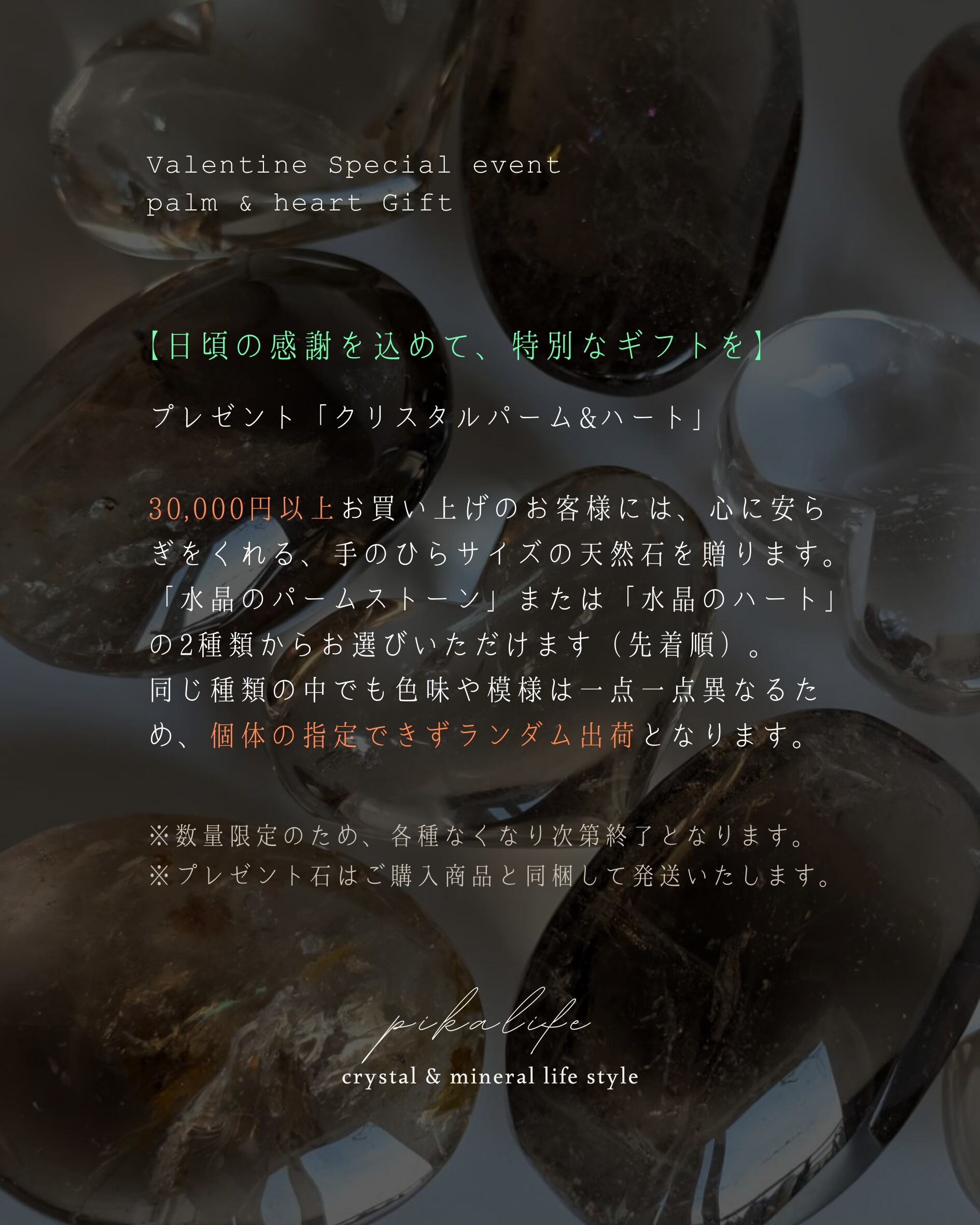 30,000円以上お買い上げのお客様には、心に安らぎをくれる、手のひらサイズの天然石を贈ります。「水晶のパームストーン」または「水晶のハート」の2種類からお選びいただけます(先着順)。