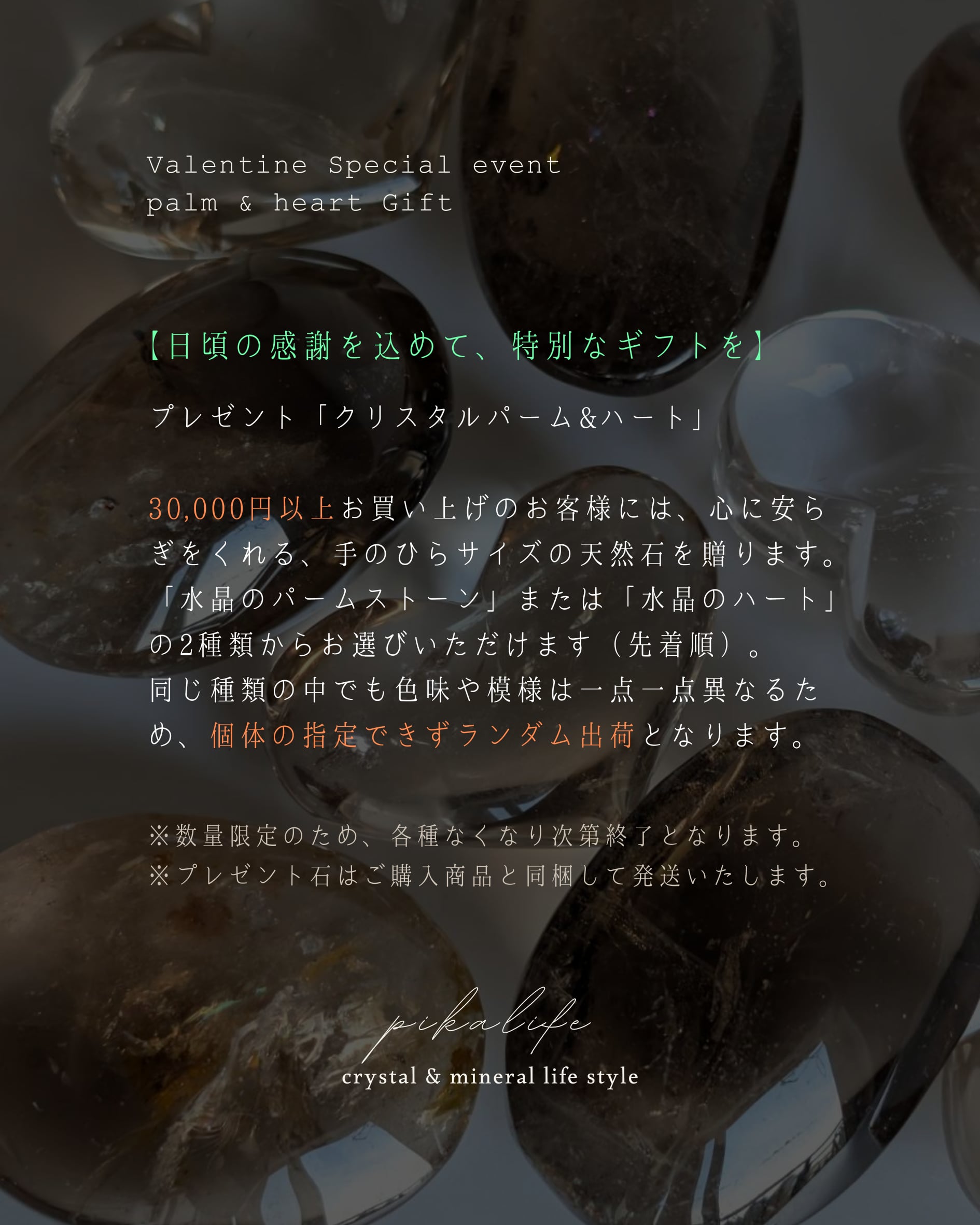30,000円以上お買い上げのお客様には、心に安らぎをくれる、手のひらサイズの天然石を贈ります。「水晶のパームストーン」または「水晶のハート」の2種類からお選びいただけます(先着順)。