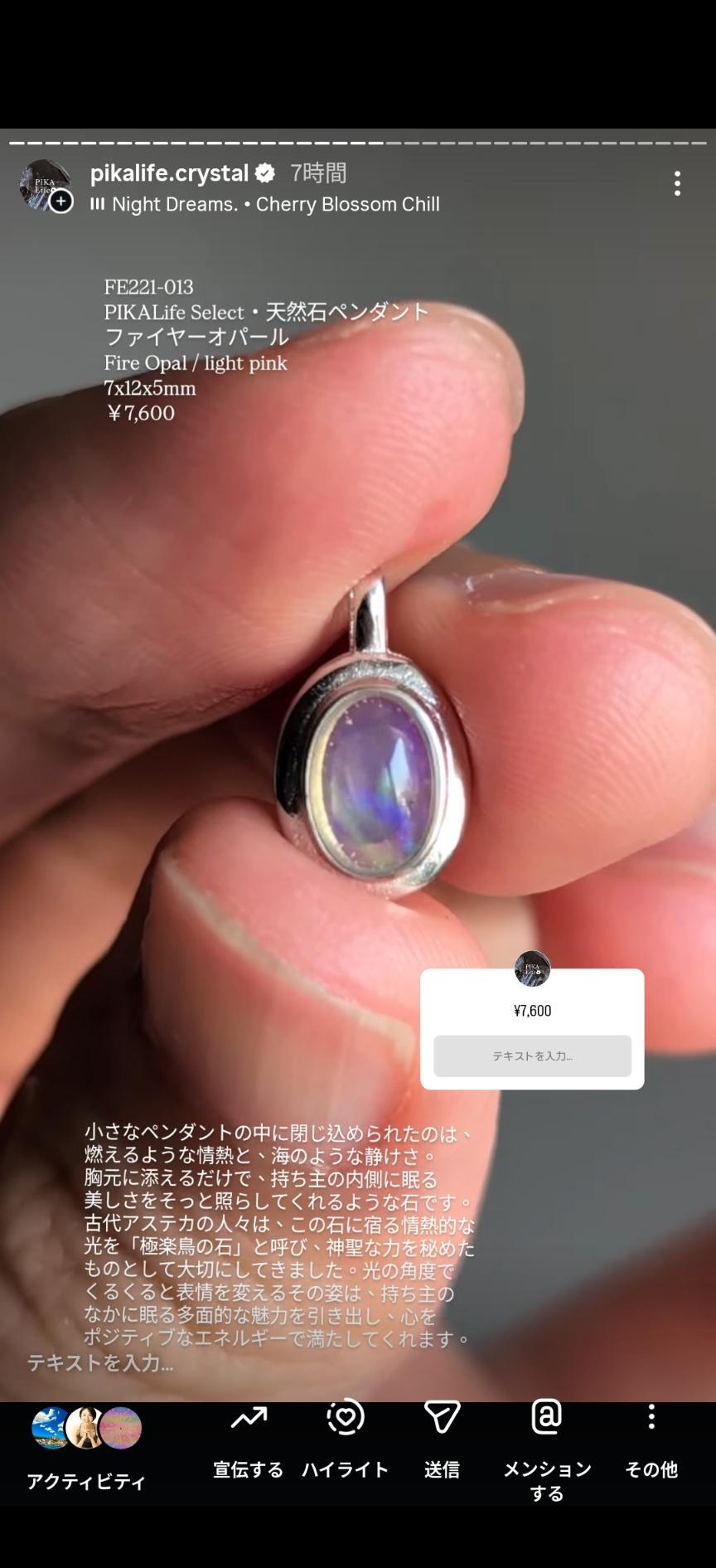 FE221-013 PIKALife Select·天然石ペンダント ファイヤーオパール Fire Opal / light pink 7x12x5mm ¥7,600