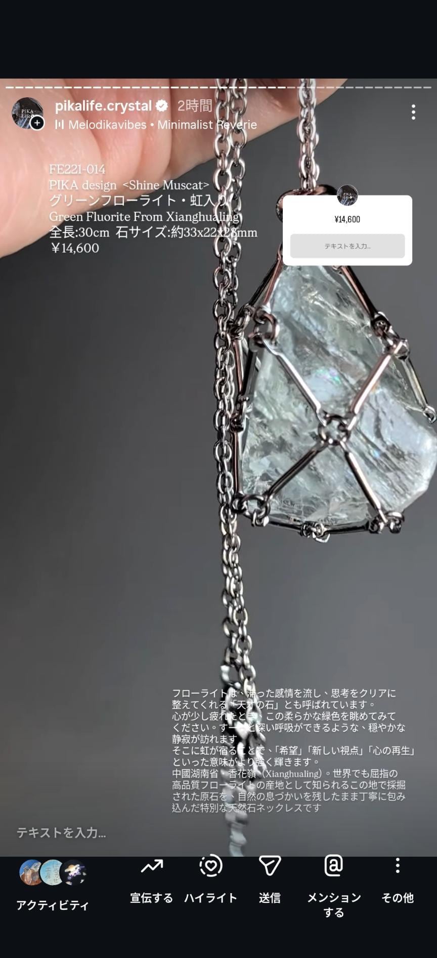 FE221-014 PIKA design <Shine Muscat> グリーンフローライト·虹入り Green Fluorite From Xianghualing 全長:30cm 石サイズ:約33×22★28mm ¥14,600