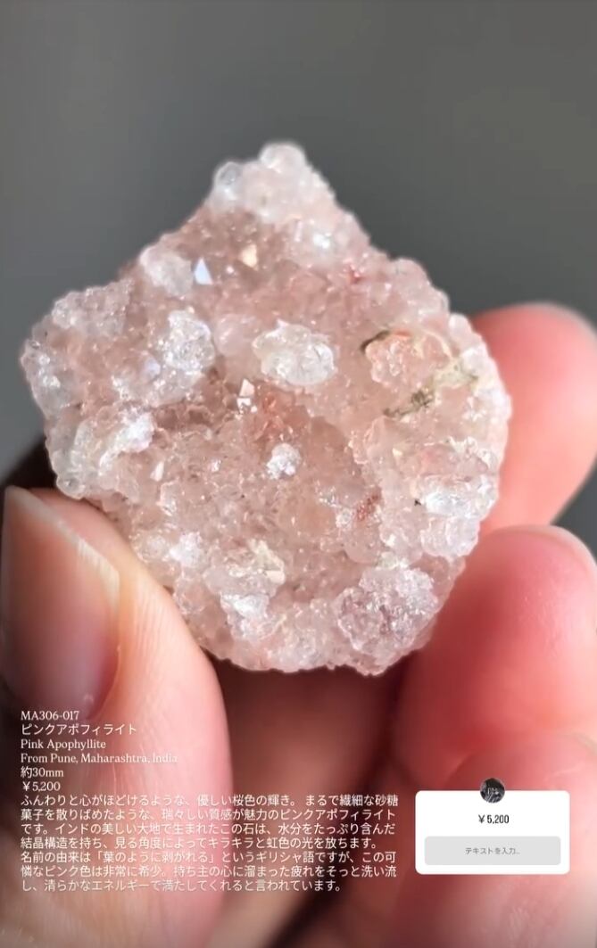 MA306-017 ピンクアポフィライト Pink Apophyllite From Pune, Maharashtra, India 約30mm ふんわりと心がほどけるような、優しい桜色の輝き。まるで繊細な砂糖 ¥5,200