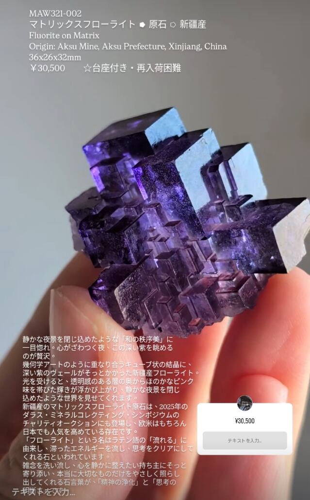 MAW321-002 マトリックスフローライト●原石◇新疆産 Fluorite on Matrix Origin: Aksu Mine, Aksu Prefecture, Xinjiang, China 36x26x32mm ¥30,500 ☆台座付き