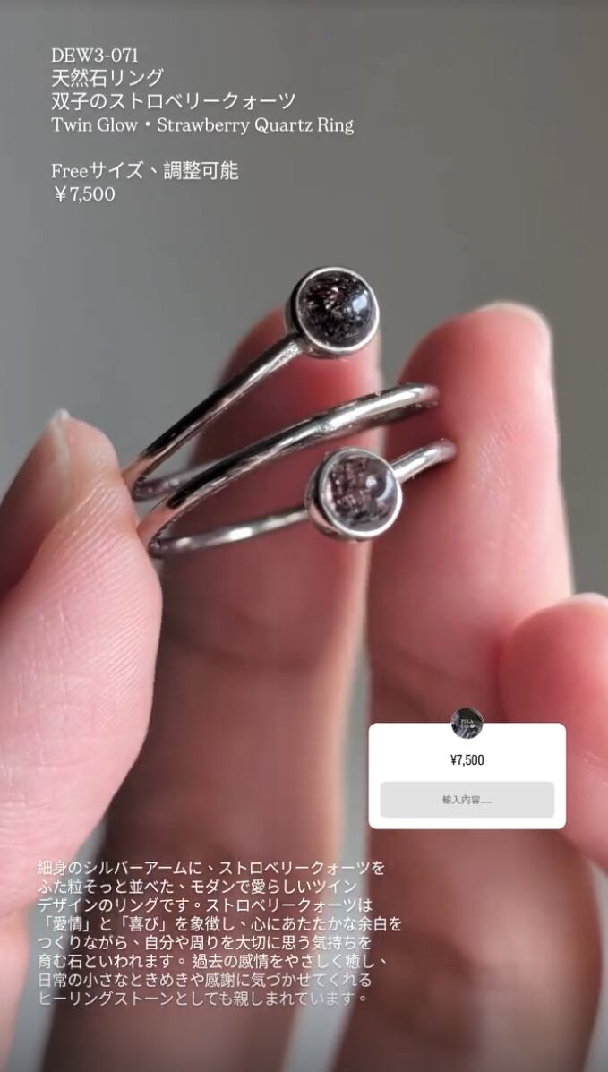 ・詳細情報はスクリーンショットにてご確認ください 沢山の応募の中、そんな特別な繋がりを感じております。 石とのご縁を大切にされる客様のお手元にお届けできること、 スタッフ一同心から嬉しく思います。 DEW3-071 天然石リング 双子のストロベリークォーツ Twin Glow . Strawberry Quartz Ring Freeサイズ、調整可能 ¥7,500